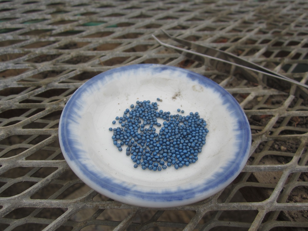 周りを農薬でコーティングしているので、このような青い色なんです。