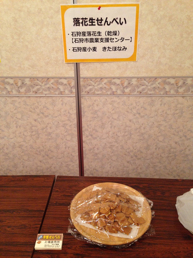 石狩産の小麦粉を使って、石狩市出身の店長さんがいるお店に頼みこんで落花生せんべいを焼いてもらいました。