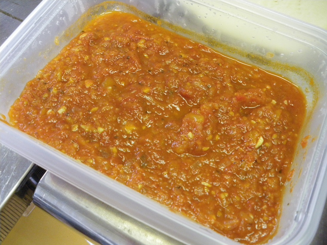 当別産小麦を使用した生地に、石狩産ミニトマトを使用したソース(前日に作りました)を塗ります。
