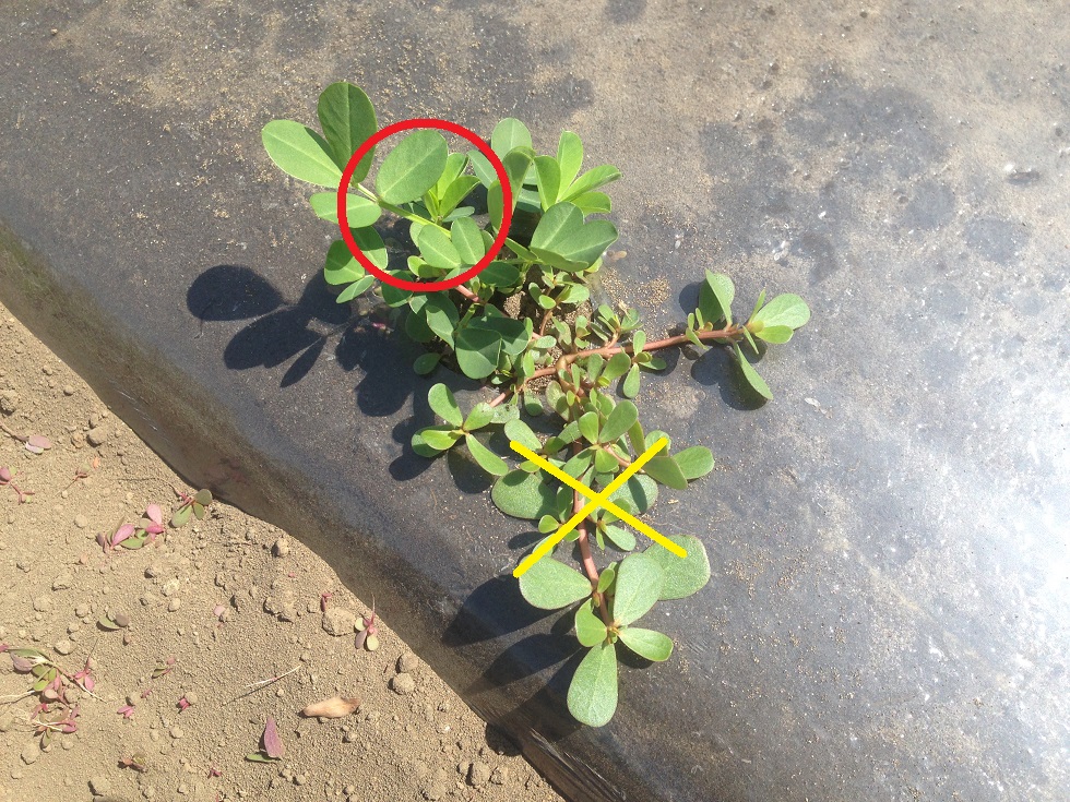 まずは不織布をはがし、マルチの穴から出ている部分と畝際の草を抜きます。