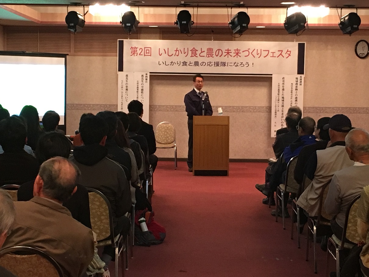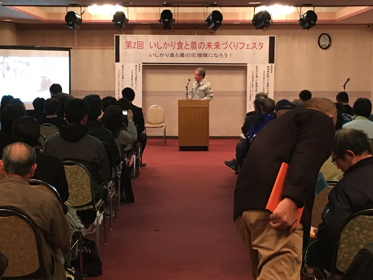 このフェスタは二部構成で、第一部は池田食品株式会社代表取締役 池田光司氏と、石狩市農業総合支援センター長(JAいしかり営農部長) 大江徹氏による基調講演と、石狩市農業総合支援センター指導員の臼澤さんによる今季の応援隊の活動の事例報告、そしてNPOひとまちつなぎ石狩 三浦さんのらっかせいの栄養についてのお話でした!