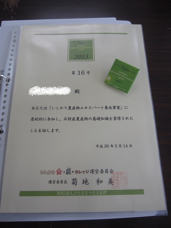 いしかり食と農のカレッジの特製バインダーに収まった修了証をいただきました。