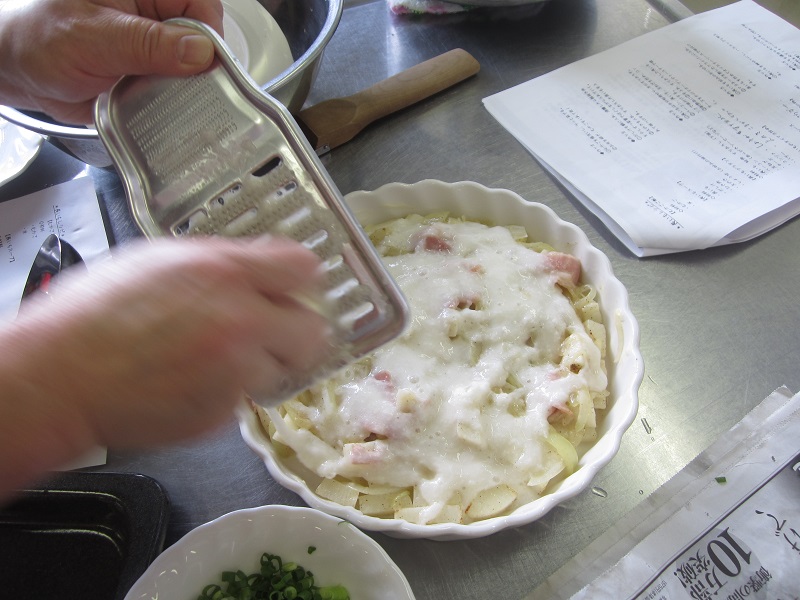長いもグラタンはホワイトソースを使わずに、炒めた長いも、玉ねぎ、ベーコンの上にすりおろした長いもを。