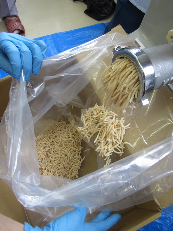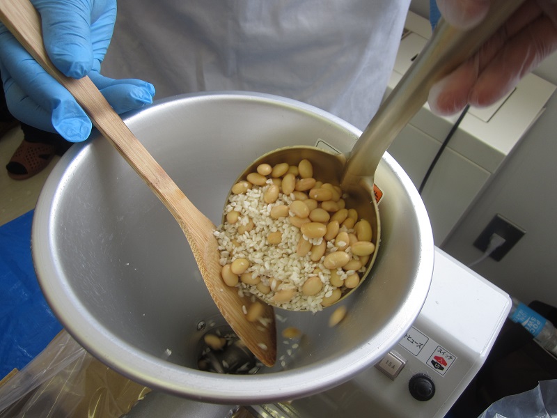 前回の講座のときに各自1kgの大豆を持ち帰っていたので、前日に各々その大豆を煮て持ってきています。