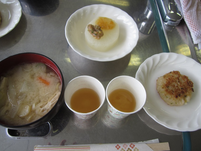 一通り皆がみそ作り作業を終え、ここで味噌を使用した料理をいただきます。