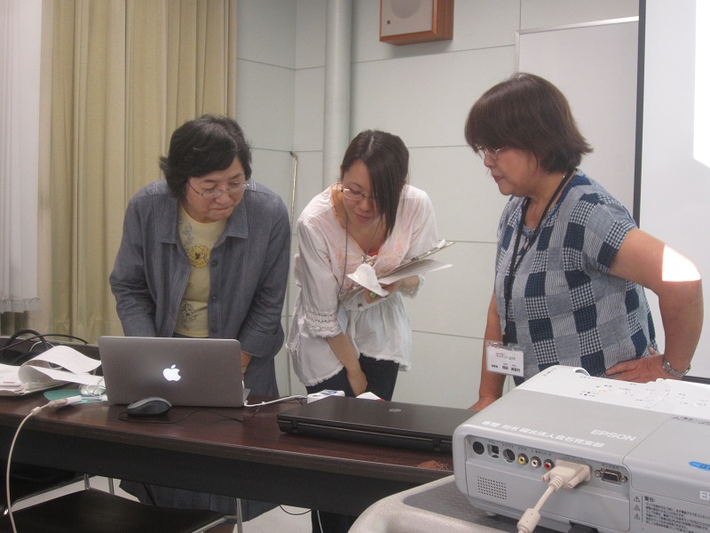 松坂教授が持ってきた糖度計で、午前中に収穫したミニトマトの糖度を計測中。