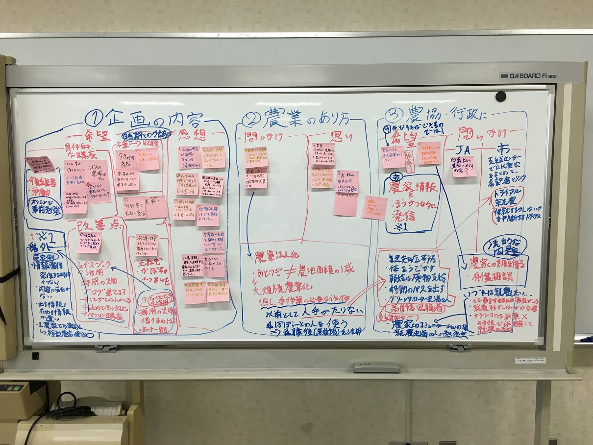 約10ヶ月間の講座を振り返って、①企画(講座)の内容について、②農業についての2つをテーマに意見・感想を各自書き出してもらいました。