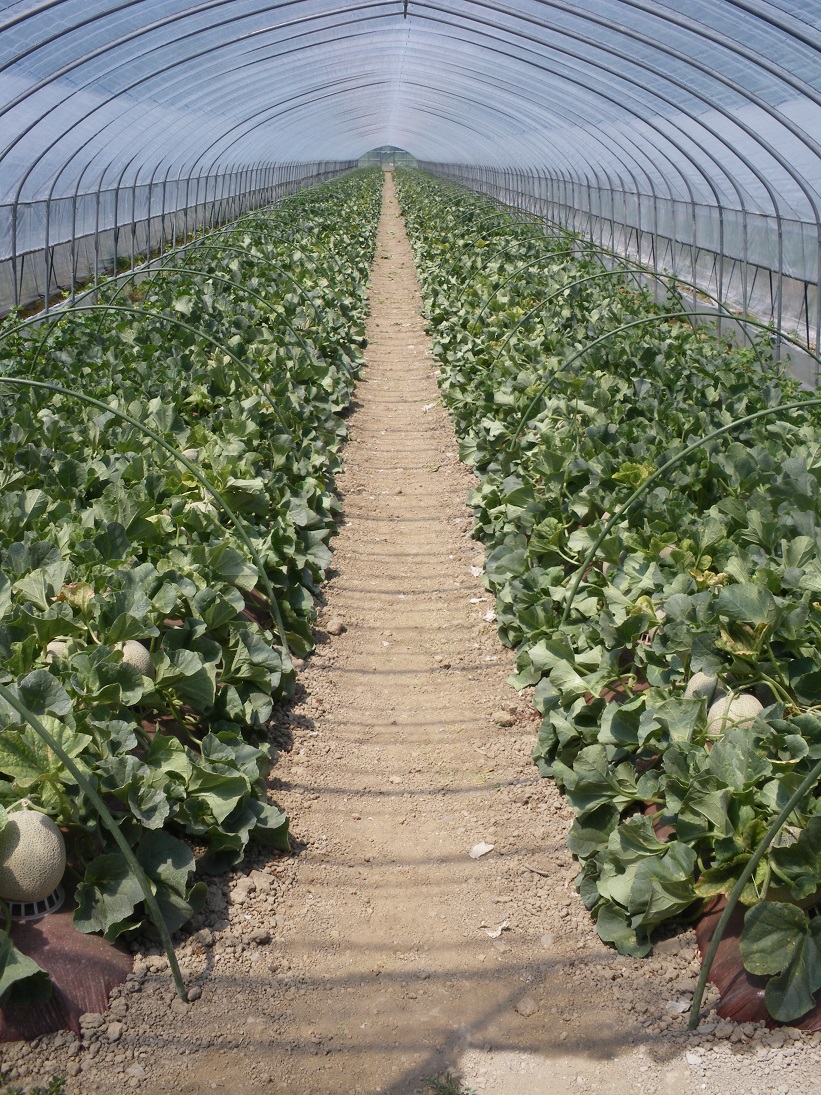 100m以上もあるこの長い長いハウスの中に、収穫間近のメロンがたくさんなっていました。