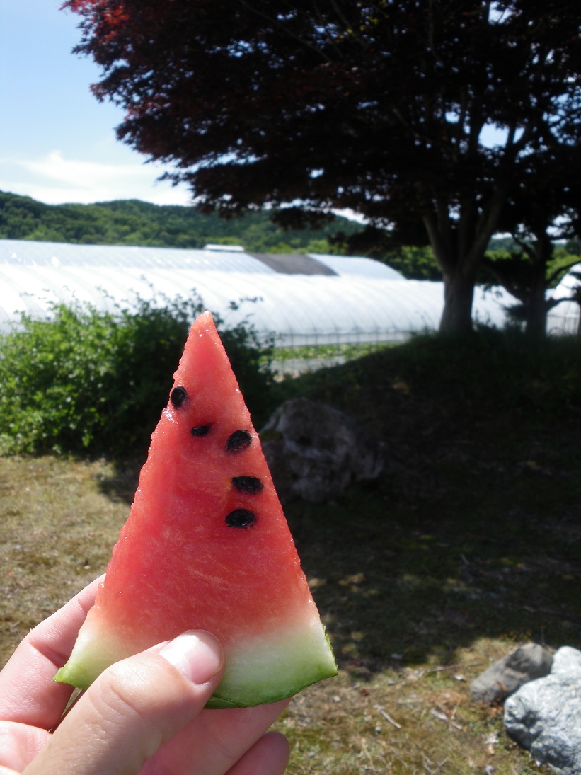先ほどハウスで見たスイカを、ご好意で試食させていただけることに![]()
