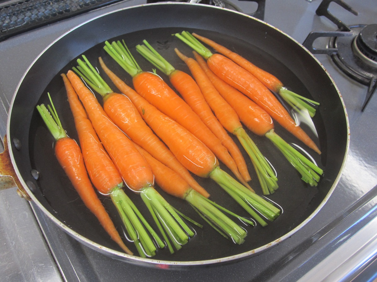 丸ごと皮ごと付けていただき方法としては、若いにんじんが良いのですが、普通のにんじんを3、4つに割って同様に調理することも出来ます。