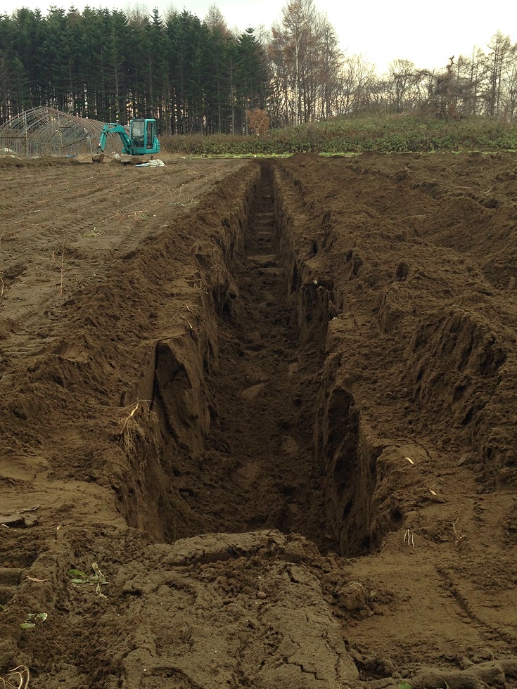 事前に機械(奥に写っているユンボという重機)で溝を掘っていただいていました。