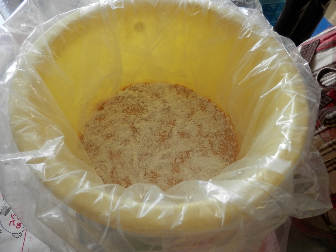 そしてチョッパーで潰した大豆、麹に塩を加えたものが入った袋(漬物袋のような厚手のものを使用します)を回転させながら捏ねます。