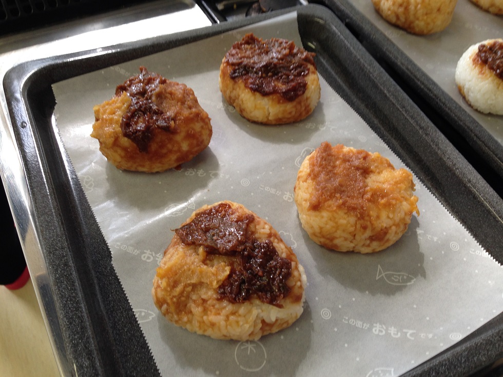 固く握った塩おにぎりに、調味味噌(味噌・みりん・お酒)を塗り、その後お好みでねぎ味噌、ゆず味噌、にんにく味噌を塗り、オーブンで焼きました。