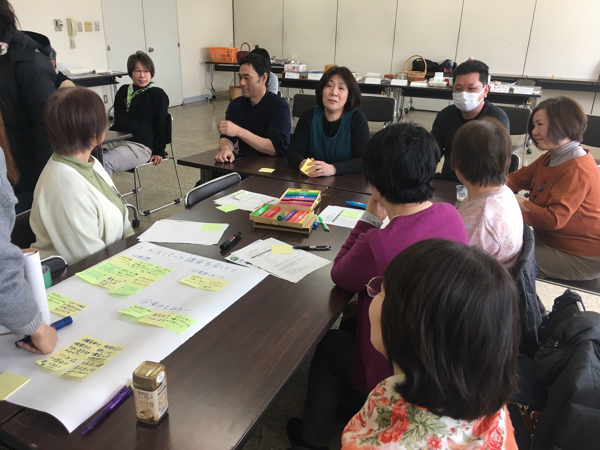 まずは、2チームに分かれてこの講座を受講した感想や、受講して何か変わったことがあるかなど、それぞれが付箋に書いて大きな模造紙にペタペタと貼っていきます。