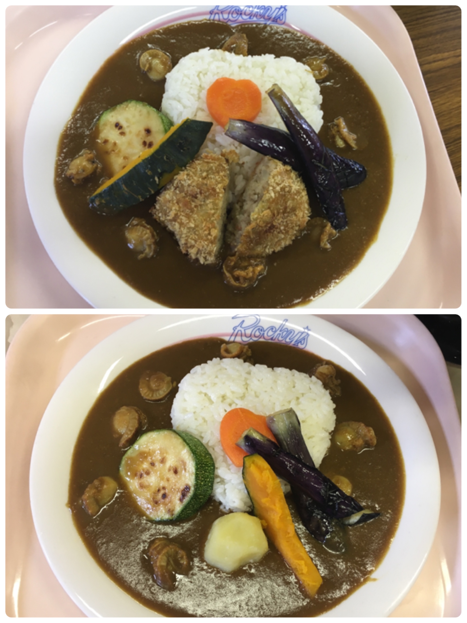 いただいたのは、浜益産のホタテの稚貝がたっぷり入ったホタテカレーと、浜益牛を使ったコロッケカレー。