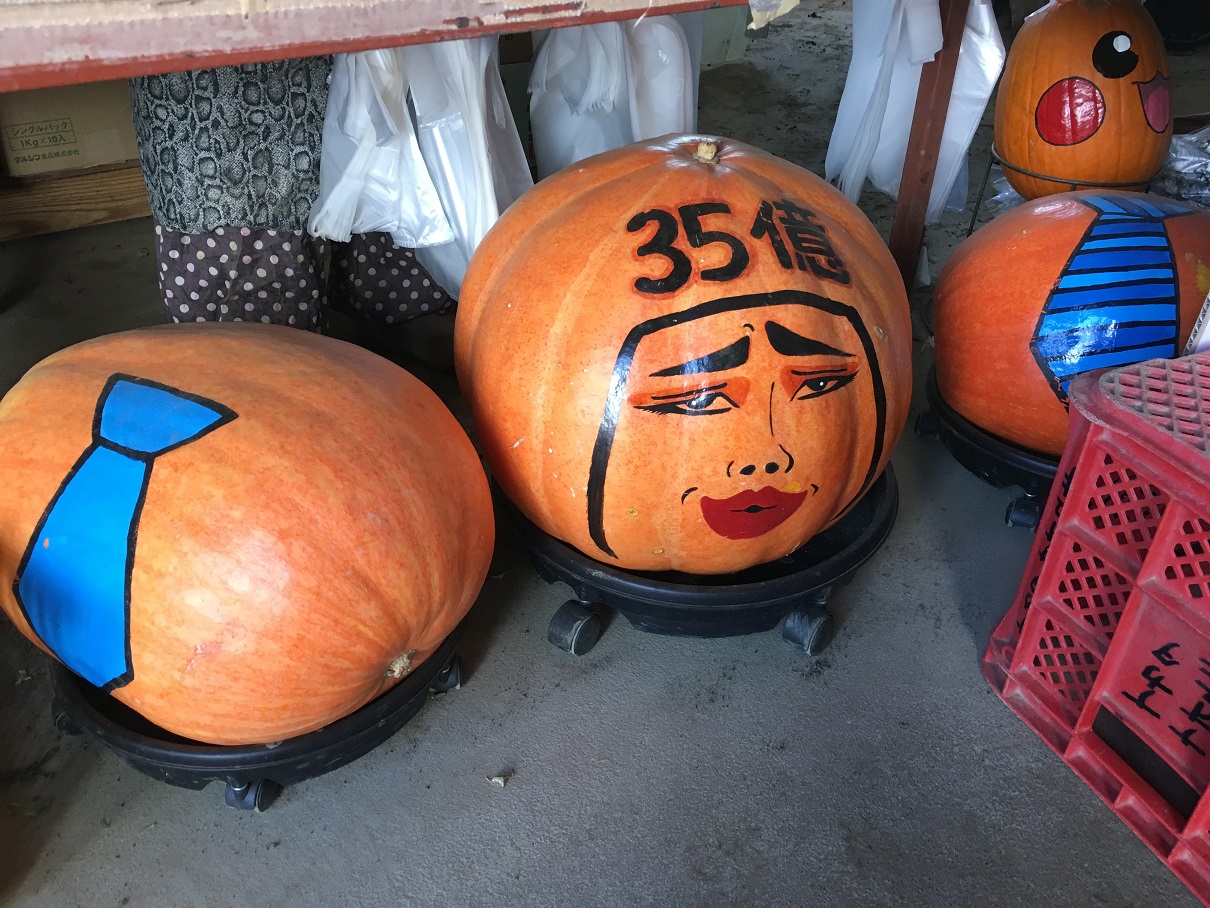 (直売所にはこんな面白いかぼちゃが飾ってあります!時々新作があるので地味に楽しみにしております・・・)