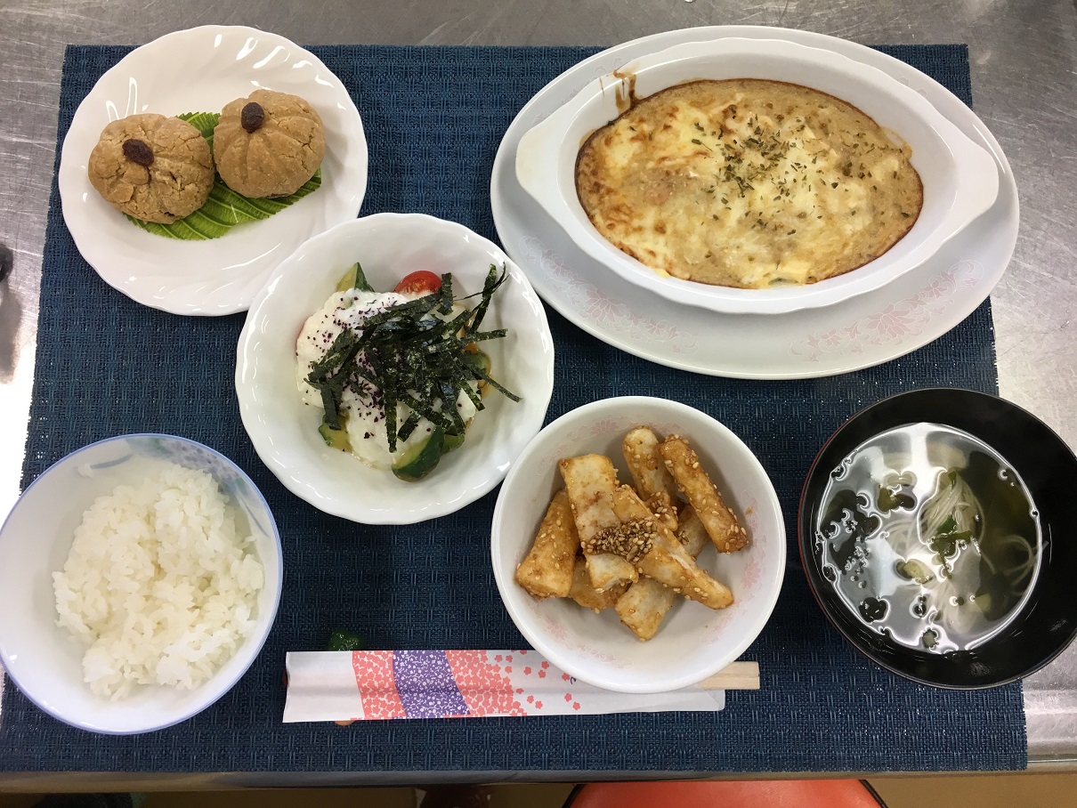グラタン、サラダ、あまから揚げ、そして和菓子!