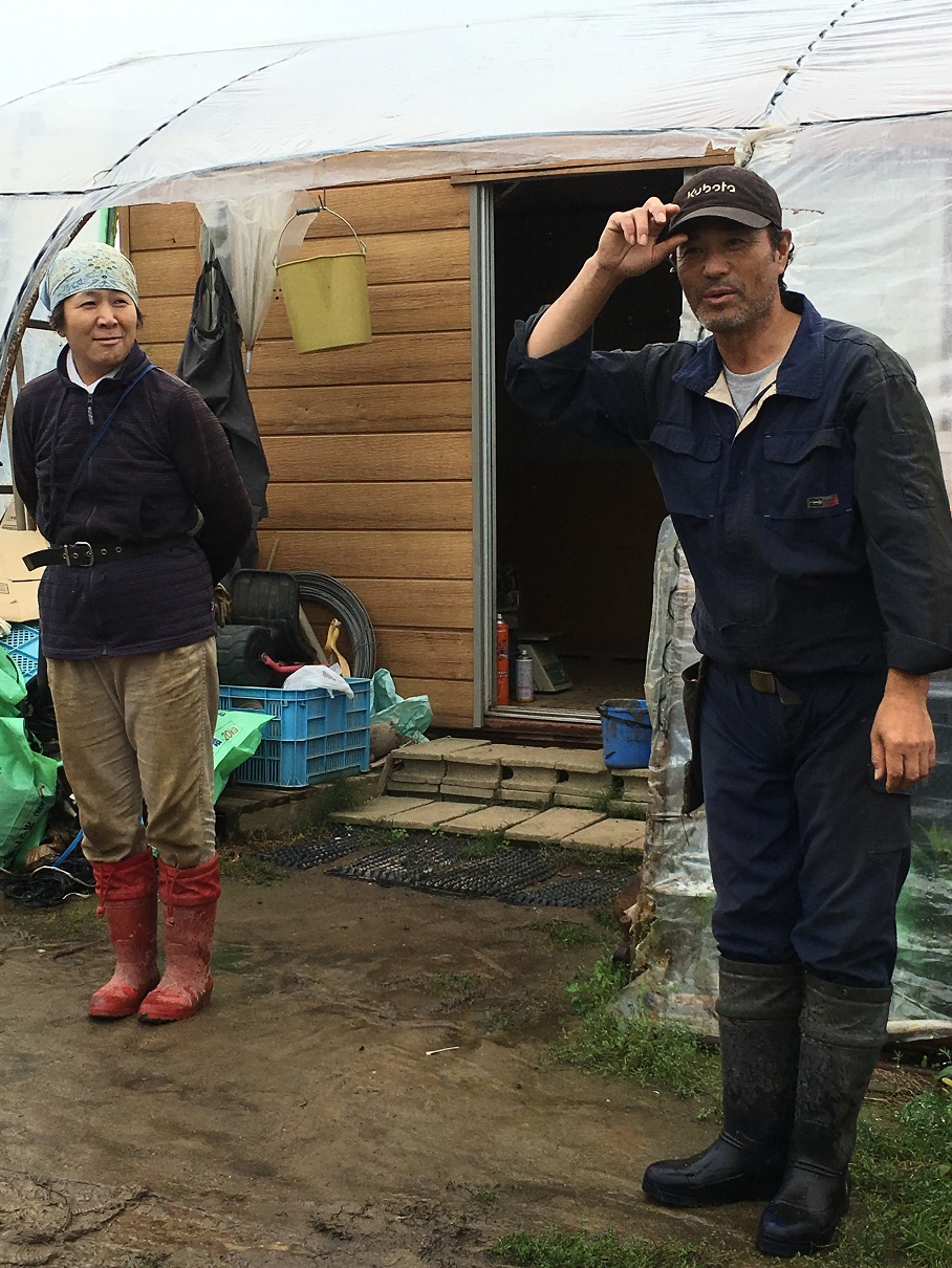 ハウスに入って、さっそく収穫のポイント(色や傷など)を教えてもらいます。