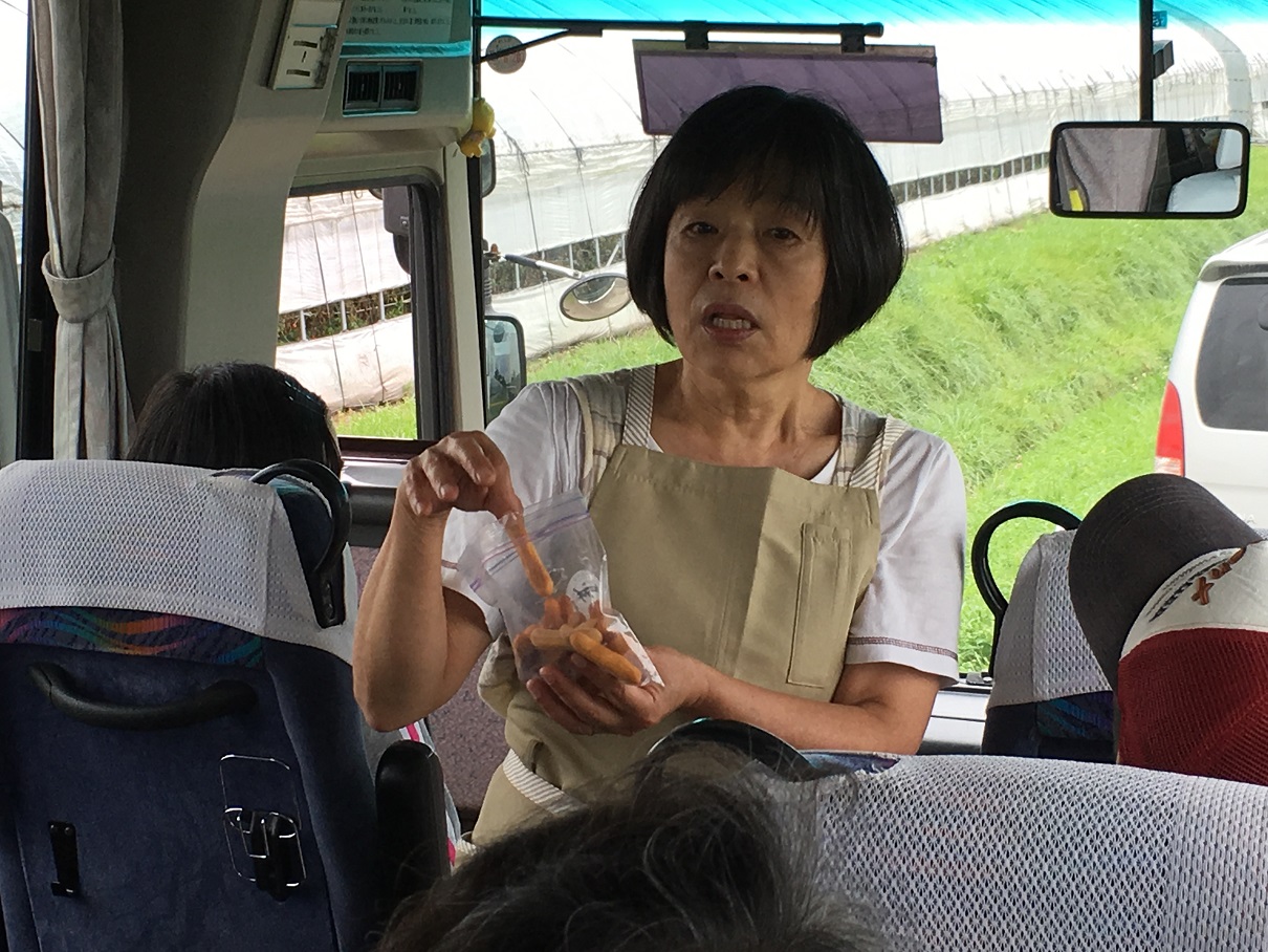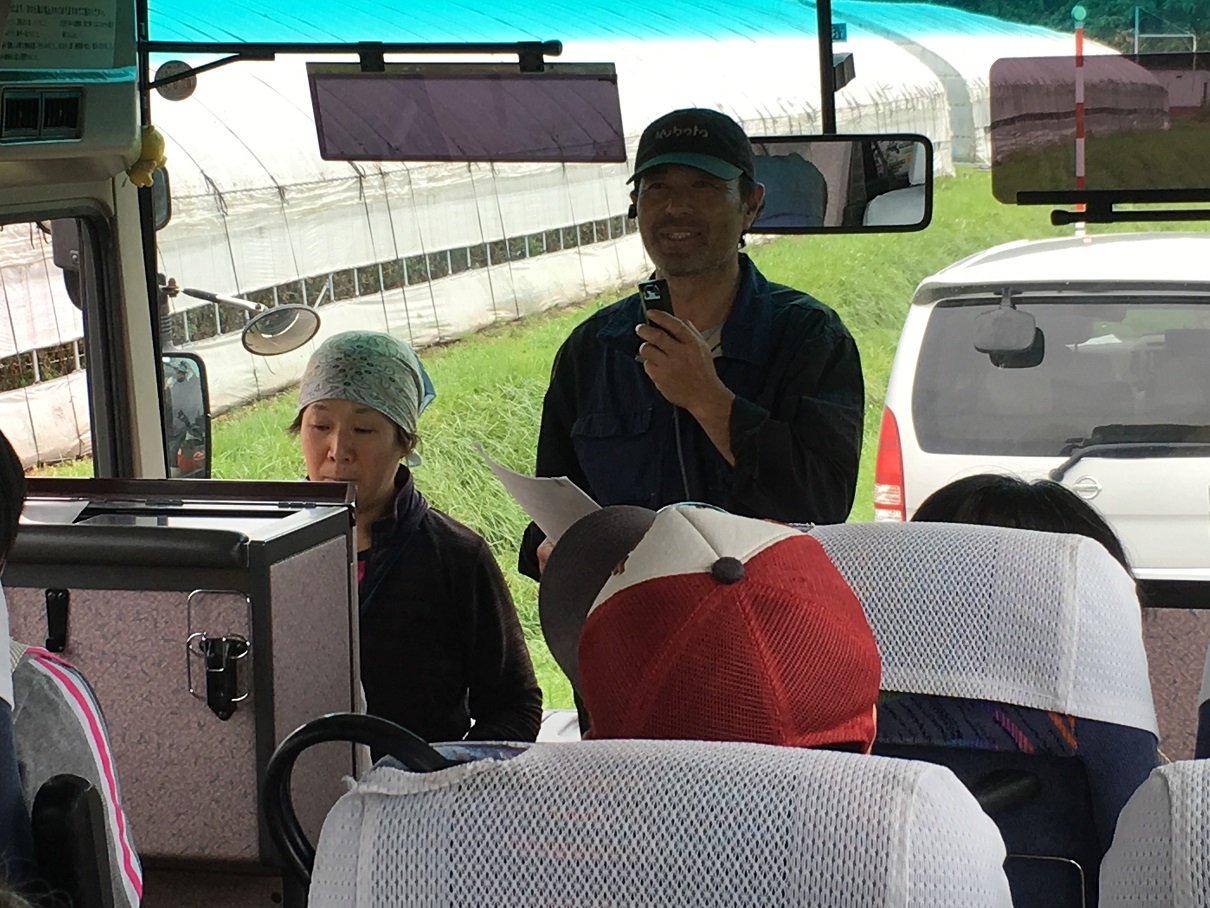 そしてついに雨が降ってきてしまったので、収穫後のお話はバスの中で聞かせていただきました。