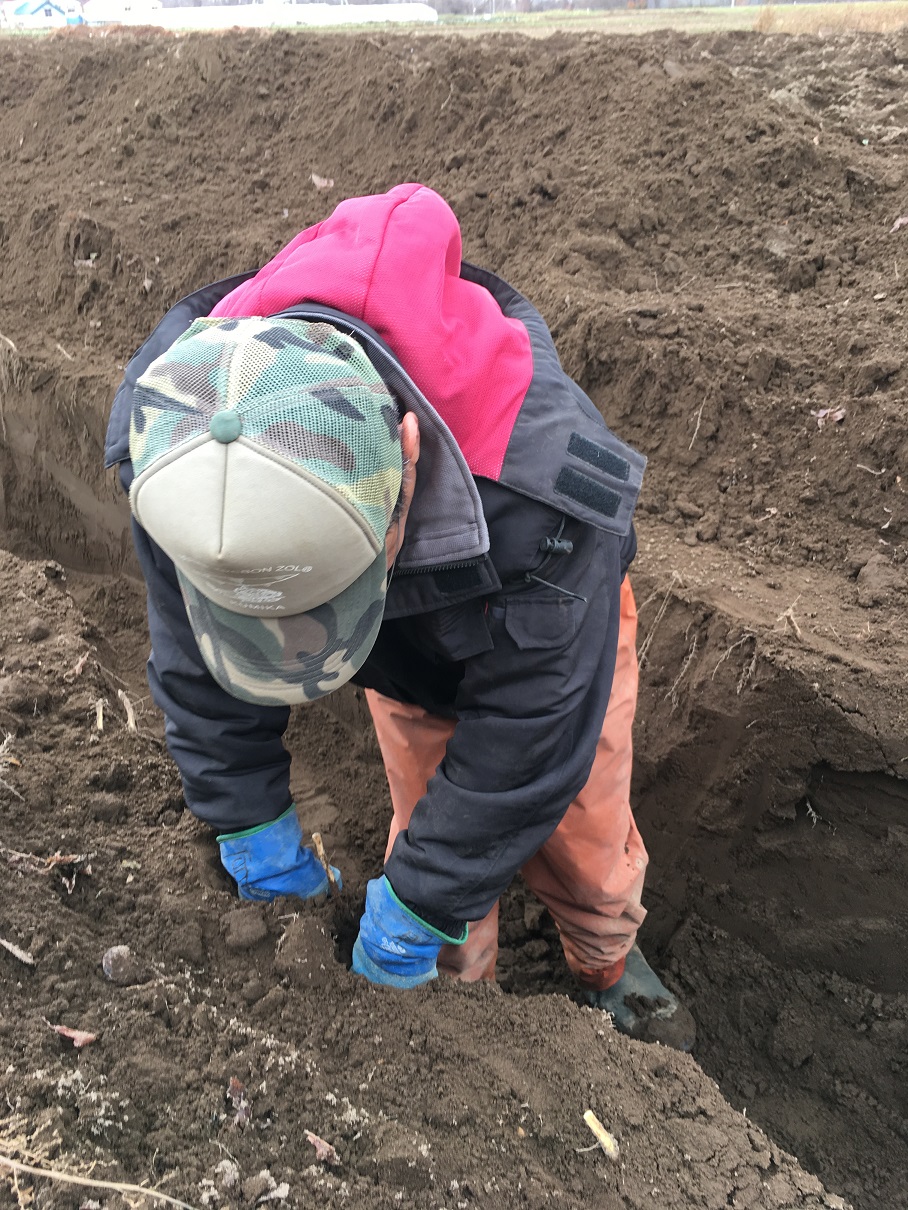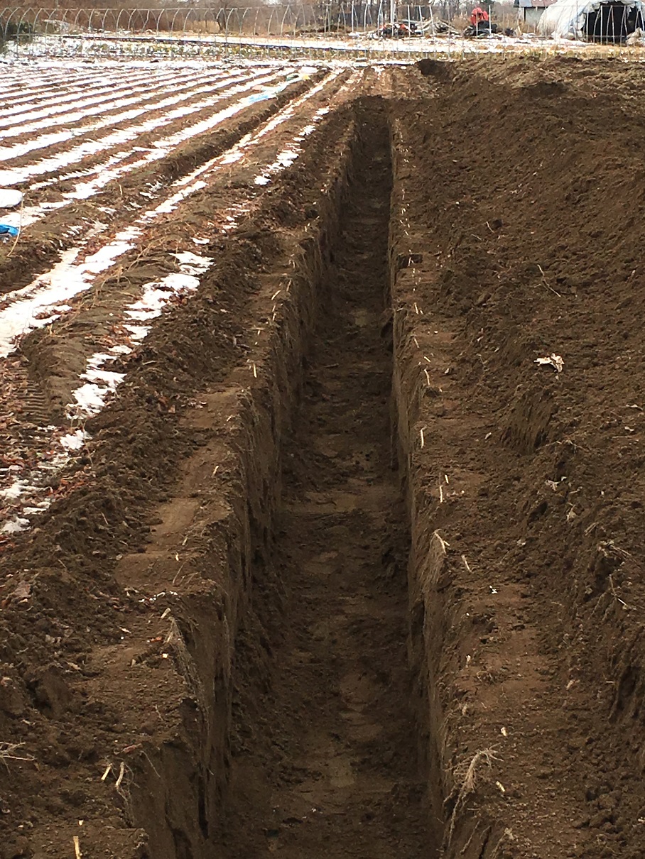 畑には油圧シャベル(ユンボ)で掘った溝がありました。